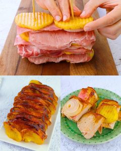 Iniziate ad assemblare gli spiedini. Disponete due spiedini su un tagliere e iniziate i vostri giri aggiungendo le patate, poi la scaloppina di maiale, gli anelli di cipolla e una fetta di pancetta.