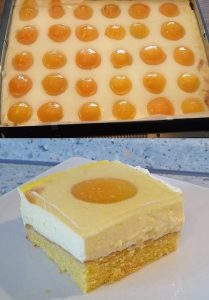 - Ora mescola il budino freddo con la panna acida e spalmala sulla torta. Disporre sopra le albicocche sgocciolate, lasciando un po’ di spazio tra loro. Poi infornate nuovamente il tutto a 200°C per circa 15 minuti.
